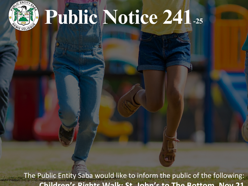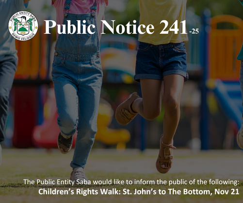 We wish to inform the public that on Friday November 21, 2025, the Children's Rights Walk will take place from St. John's to Princess Juliana Sports Field in The Bottom, beginning from 6:00 p.m. to 7:30 p.m.