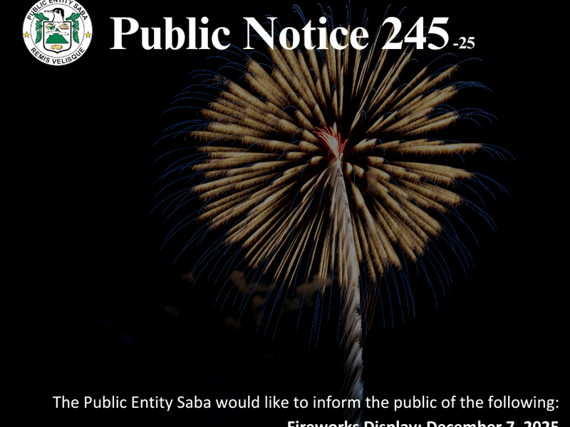 We wish to inform the public that on Sunday December 7th, a fireworks display will take place at the Fort Bay Harbor from 11:55 p.m. to 11:59 p.m.