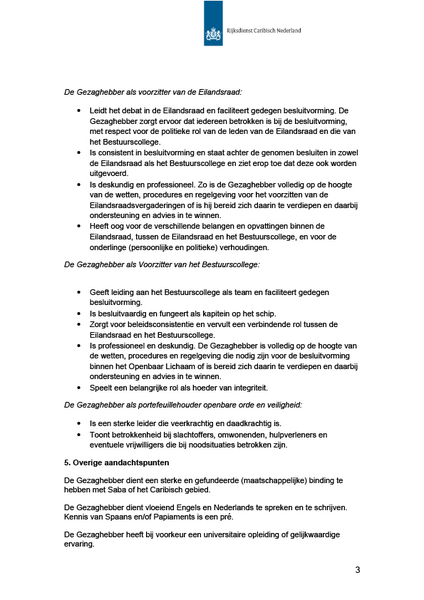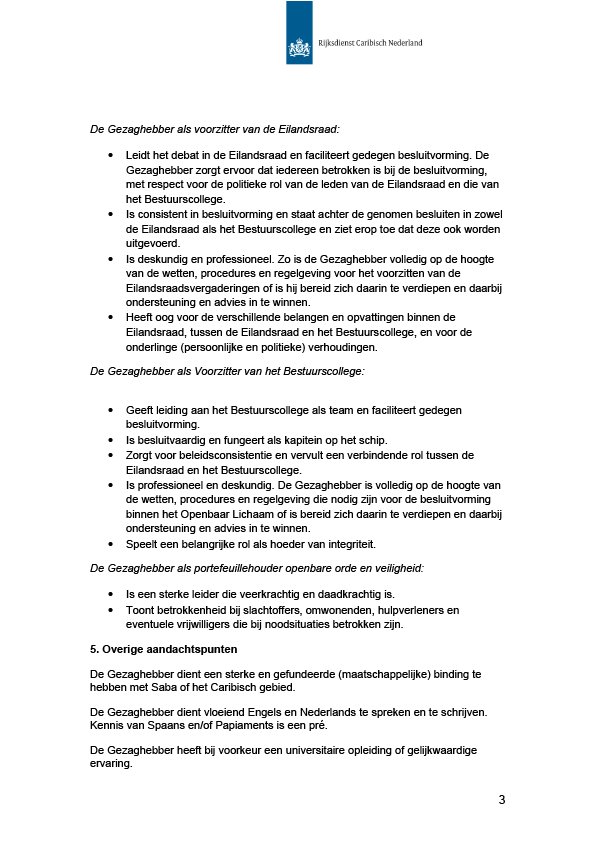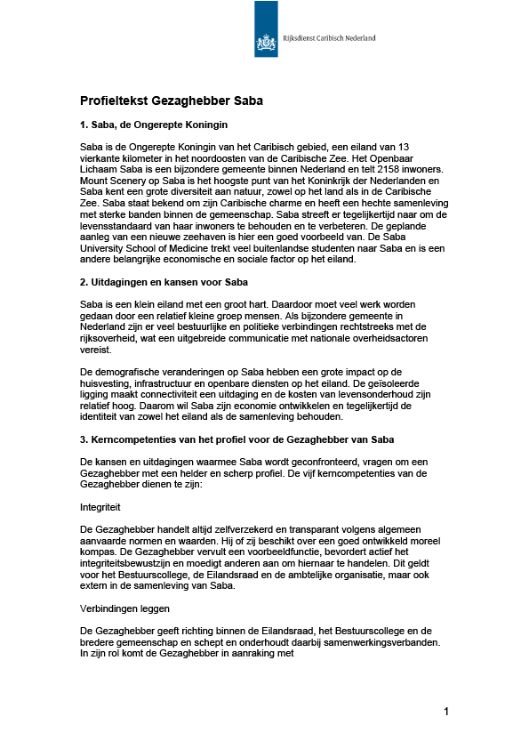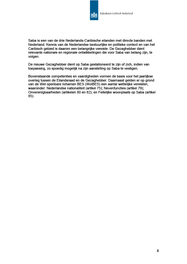 De (waarnemend) Rijksvertegenwoordiger is samen met de Eilandsraad van het openbaar lichaam Saba tot een profielschets gekomen die zal worden gebruikt bij het selecteren van kandidaten. De profielschets kan digitaal worden geraadpleegd op www.rijksdienstcn.com/vacatures. De profielschets is tevens per e-mail op te vragen bij het secretariaat van de (waarnemend) Rijksvertegenwoordiger via het e-mailadres: gezaghebbersaba@rijksdienstcn.com.