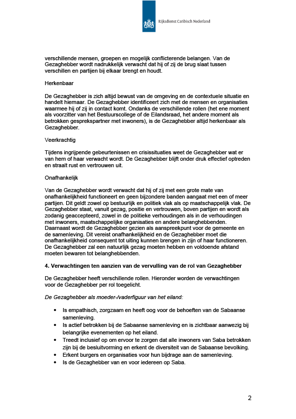 Bij eventuele vragen over de procedure of functie, kunt u telefonisch contact opnemen met het secretariaat van de (waarnemend) Rijksvertegenwoordiger via gezaghebbersaba@rijksdienstcn.com of via +599 715 8304.