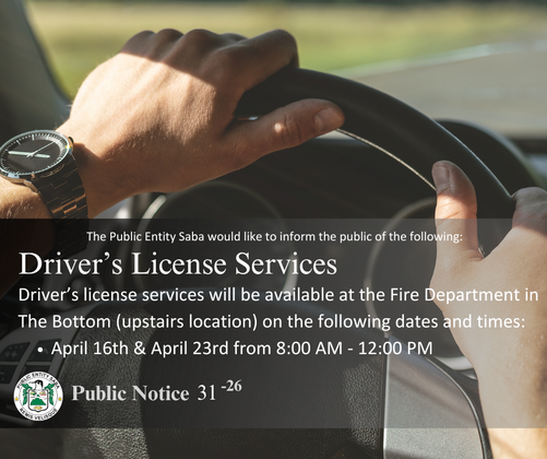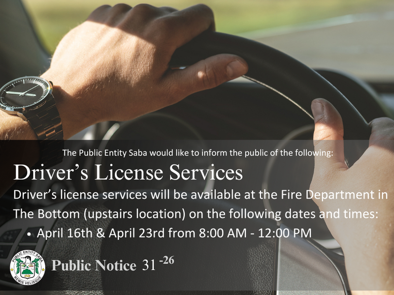 The public is hereby informed that driver’s license services, including driving exams, will be available at the Fire Department in The Bottom (upstairs location) on the following dates: