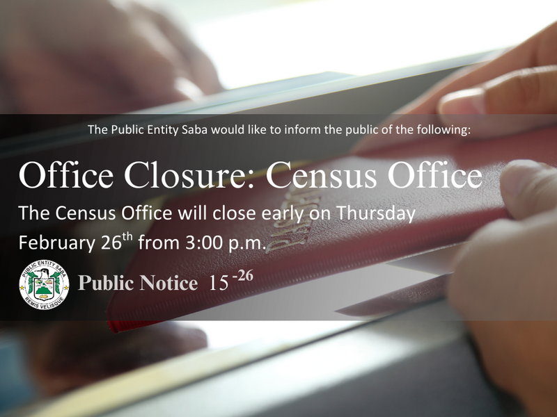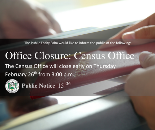 We wish to inform the public that on Thursday February 26th, the Census Office will be closed from 3:00 p.m.