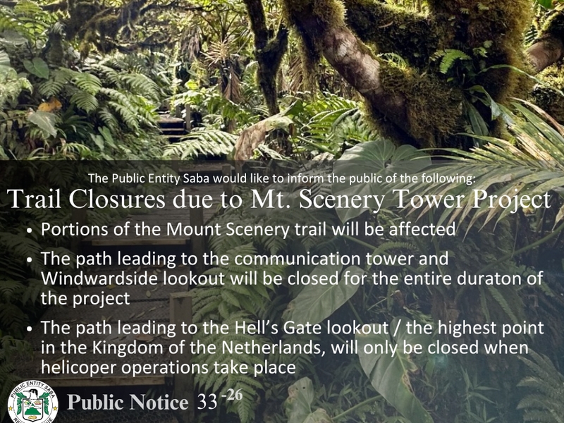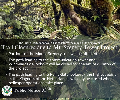 The path on the right (shown as a red line), leading to the communication tower and Windwardside lookout will be entirely closed for the complete duration of this project, with an estimated completion date in July 2026.