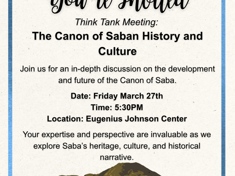 The Department of Community Development and Culture Saba in collaboration with the Saba Heritage Center invites the community to attend a Think Tank meeting for the development of the Saba Canon of History and Culture.