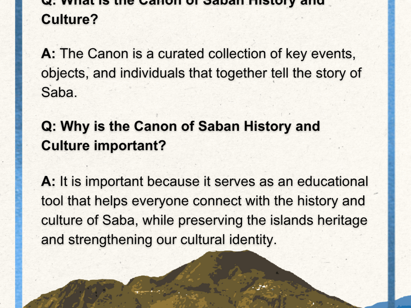 The Saba Canon of History and Culture is a curated framework of key events, people, places, and themes that together tell the story of Saba’s development and identity. It is intended to serve as an accessible and authoritative reference for education, public engagement, and cultural preservation, ensuring that Saba’s heritage is documented and shared for current and future generations.