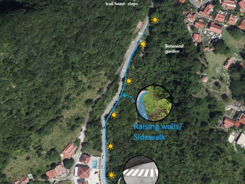 This road section, including the area near Arawak Hotel is heavily used by both vehicles and pedestrians. Planned safety measures include the installation of street lighting, sidewalks, pedestrian crossings, reflective elements on safety walls, and speed bumps.